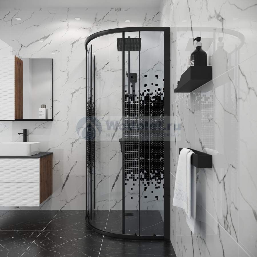 Купить душевой уголок 77.5x77.5 см Niagara Eco 78x78 NG-1003-14BLACK стекло мозаика, профиль черный матовый Россия-Китай форма: четверть круга в Москве в магазине Водолей удобно с доставкой и установкой. У нас установлена самая низкая цена: душевой уголок Niagara Eco 78x78 NG-1003-14BLACK стекло мозаика, профиль черный матовый дверь: раздвижная стоит 7500 руб. Если нашли дешевле – дадим скидку!