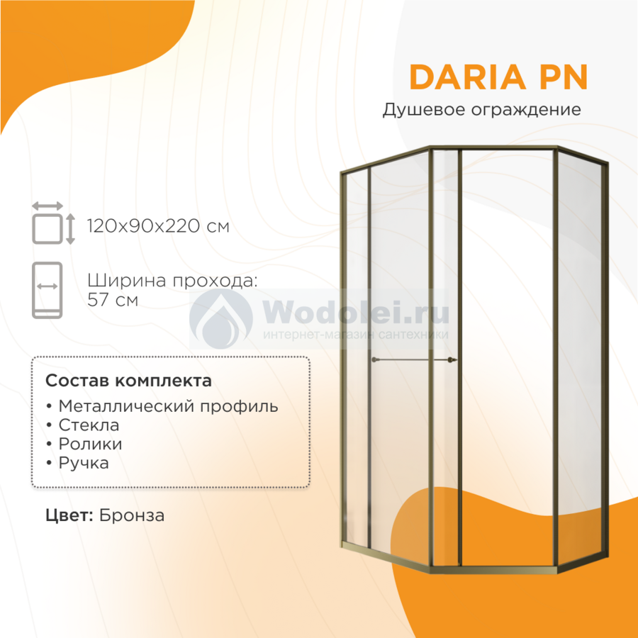 Купить душевой уголок 120x90 см Радомир Daria PN 120x90 1-10-4-1-0-354 стекло прозрачное, профиль бронза, левый Россия форма: пятиугольная в Москве в интернет-магазине Водолей удобно с доставкой и установкой. У нас установлена самая низкая цена: душевой уголок Радомир Daria PN 120x90 1-10-4-1-0-354 стекло прозрачное, профиль бронза, левый дверь: раздвижная за 81080 руб. Если нашли дешевле – предоставим скидку!