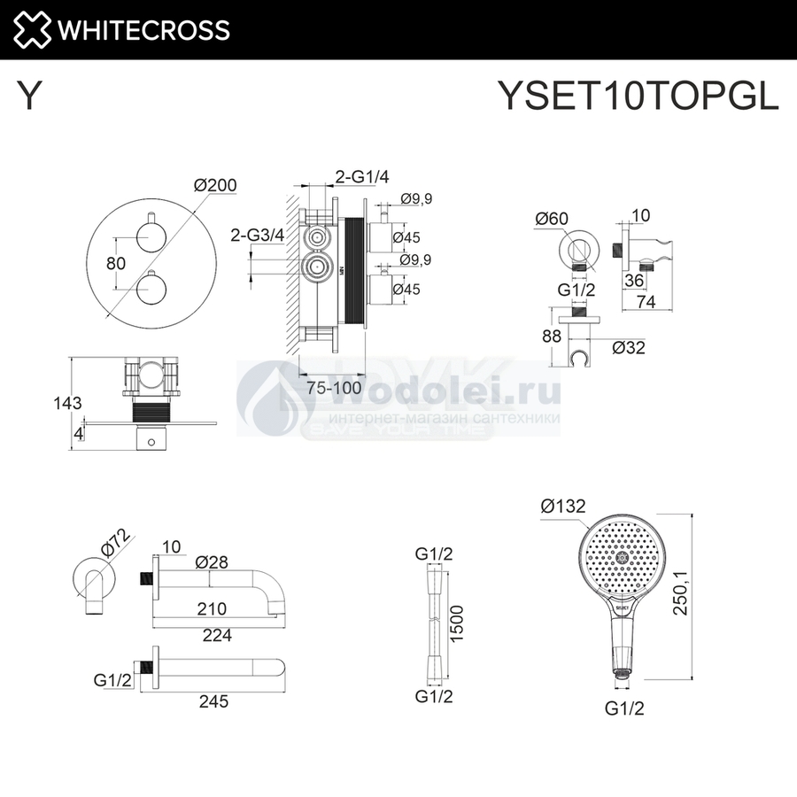 Встраиваемая душевая система Whitecross Y YSET10TOPGL с термостатом и изливом, золото