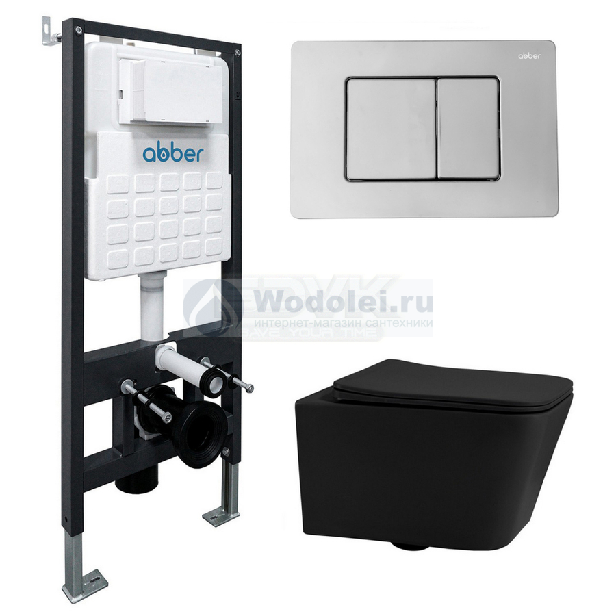 Купить подвесной унитаз Abber Rechteck AC1201MB-AC0105-AC0120 безободковый, черный матовый, кнопка хром Германия горизонтальное (в стену) выход в Москве в интернет-магазине Wodolei удобно с доставкой и установкой. У нас гарантированно выгодная цена: черный комплект подвесного унитаза с инсталляцией Abber Rechteck AC1201MB-AC0105-AC0120 безободковый, черный матовый, кнопка хром (керамика) стоит 38600 руб. Если нашли дешевле – просите скидку!