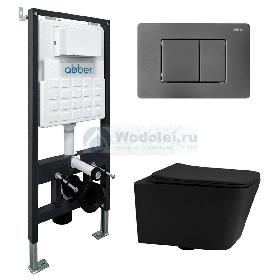 Комплект подвесного унитаза с инсталляцией Abber Rechteck AC1201MB-AC0105-AC0120NG безободковый, черный матовый, кнопка никель