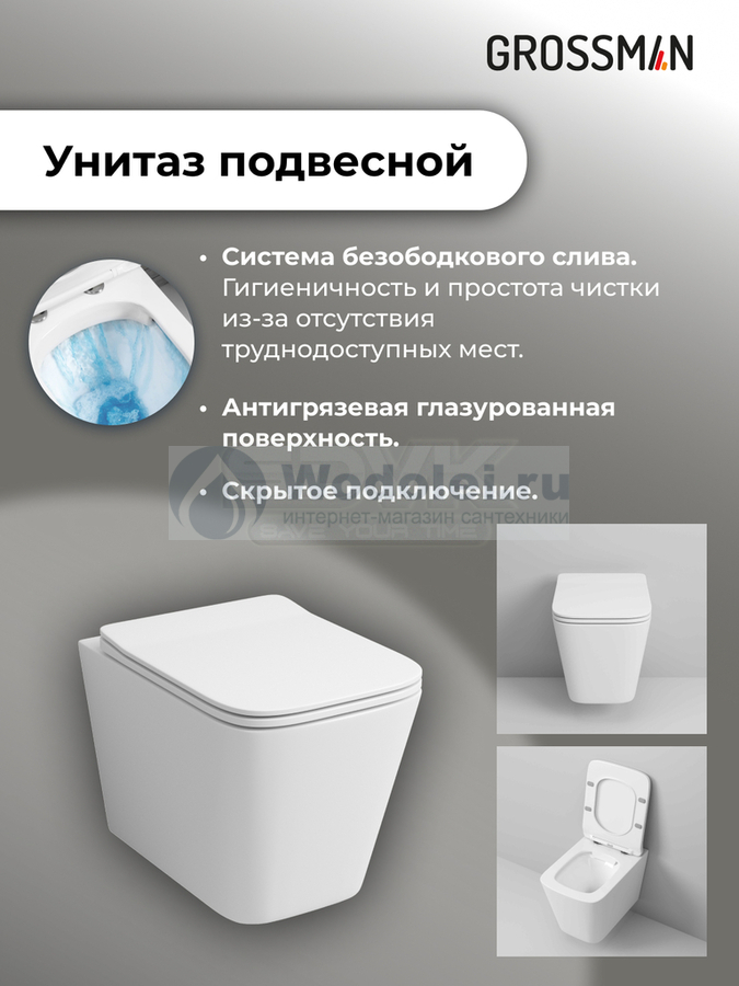Купить подвесной унитаз Grossman Galaxy 97.4441S.01.310 безободковый, белый + Кнопка смыва золото матовое Китай горизонтальное (в стену) выход в Москве в интернет-магазине Водолей удобно с доставкой и установкой. У нас установлена самая низкая цена: белый комплект Унитаз подвесной с инсталляцией Grossman Galaxy 97.4441S.01.310 безободковый, белый + Кнопка смыва золото матовое (сантехнический фарфор) стоит 19400 руб. Если нашли дешевле – дадим скидку!