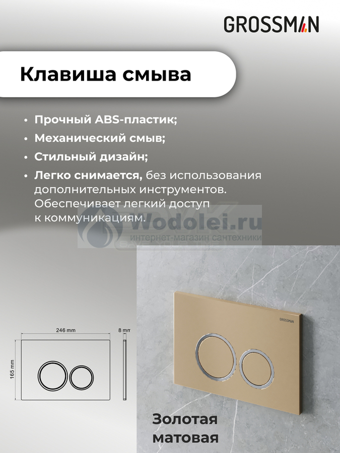 Комплект Унитаз подвесной с инсталляцией Grossman Galaxy 97.4441S.01.310 безободковый, белый + Кнопка смыва золото матовое