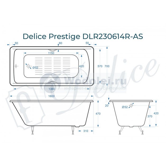Отзывы о Delice Prestige 160х70 DLR230614R-AS с отверстиями под ручки и антискользящим покрытием, белая